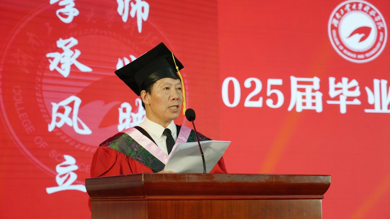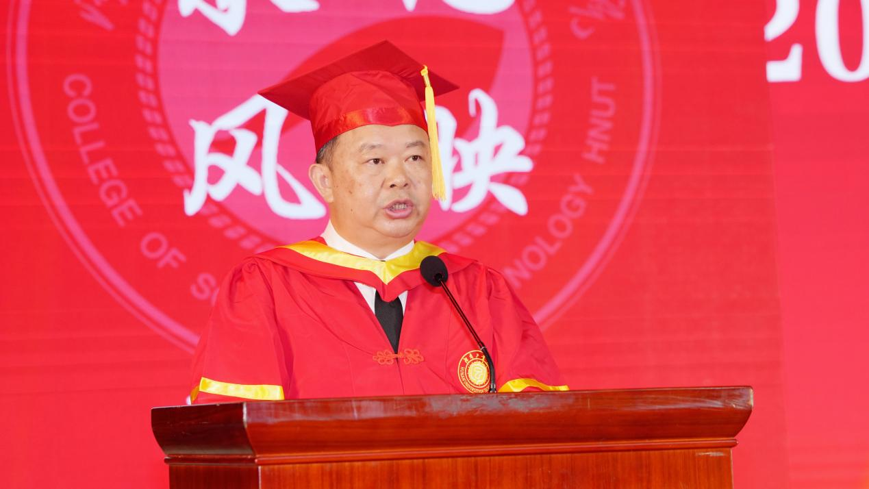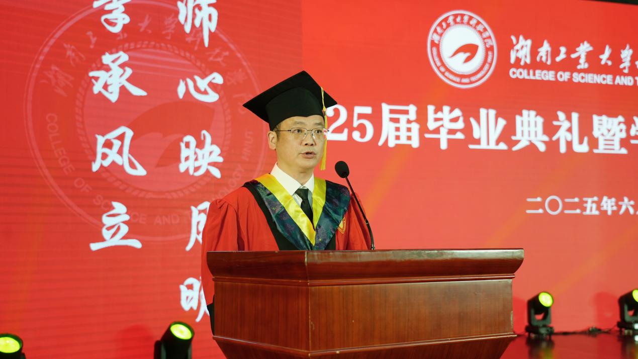 毕业典礼上,校党委书记刘望代表学校党委、行政向全体毕业生致以最热烈的祝贺和最美好的祝福。他希望同学们:一要始终坚定远大的理想,做胸怀家国的奋斗者,紧握历史的接力棒,在科技创新的最前沿勇攀高峰,在乡村振兴的第一线奉献才智,在国际交流的大舞台展现风采,在中国式现代化进程中续写更加辉煌的篇章;二要以工大男篮为榜样,始终保持“众志成城、顽强拼搏、挑战极限、永不言败、追求卓越”的精神,并将这种精神融入每一个工大人的血脉中,融入到今后的学习、工作和生活中,在人生的宽广舞台上绽放绚丽的青春光彩;三要继续发扬脚踏实地、敢于实践的良好作风,把学习动力转化为行动能力,一步一个脚印奋斗实干,一点一滴浇灌梦想之花,通过自身的努力奋斗将人生的宏伟蓝图转化为美好现实。